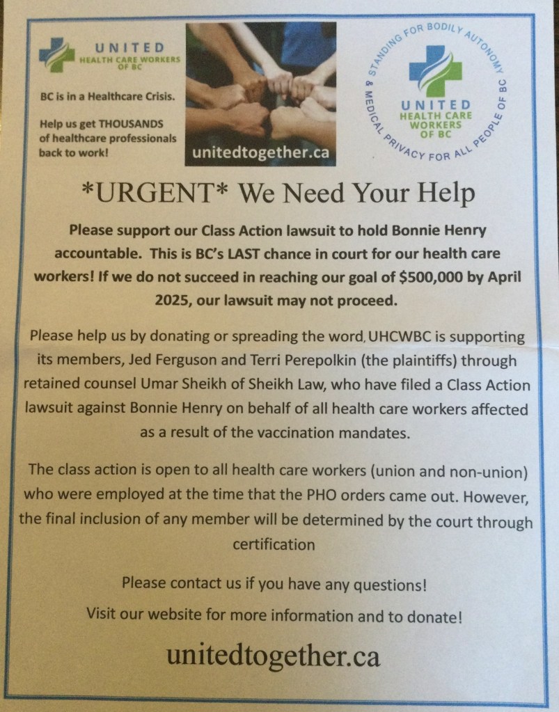 The certification hearing for two class action law suits will be held April 28 to May 2, 2025, in B.C. Supreme Court. Monica Krenbrink is among the thousands who were fired for declining the experimental “vaccine”. Each UHCWBC society member is responsible for contributing a share of the $500,000 it costs for the legal case to proceed.